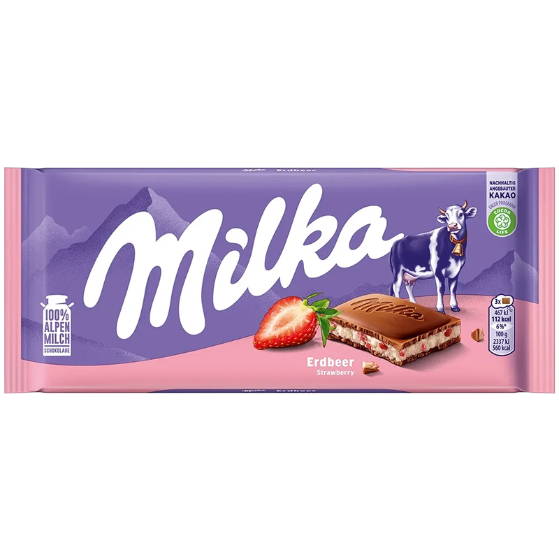 Milka me Luleshtrydhe është një çokollatë e shijshme e bërë nga qumështi i freskët i Alpeve, që kombinon çokollatën e butë me mbushjen kremoze dhe të ëmbël të luleshtrydheve. Kjo përzierje harmonike e shijeve ofron një përvojë të mrekullueshme për dashamirët e ëmbëlsirave. Ideale për t’u shijuar në çdo moment të ditës!